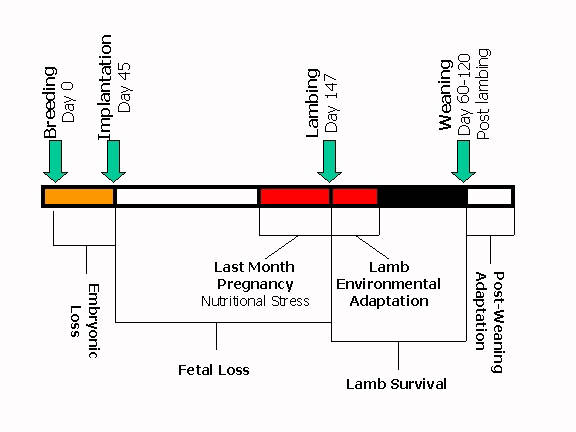 A ewe's reproductive timeline is depicted graphically below. The critical time periods include the last month of pregnancy (nutritional stress) and the first month after lambing (period of environmental adaption for the lamb). Again, periods in which reproductive wastage occurs are between ovulation and implantation for embryonic loss, between implantation and parturition for fetal loss and between parturition and weaning for lamb loss.
