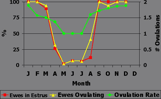 Breeding Season: Sheep are seasonal breeders or in other words will only breed during certain times of the year. Although the initiation and end of this period varies with breed of sheep and temperature, it tends to be most affected by day length. Basically sheep breed in decreasing or short day lengths. Common domestic sheep breeds have breeding seasons of five to seven months. In Montana, generally a few ewes will start cycling in September. By October all ewes will generally be cycling (see figure below). If some ram lambs have been left intact for replacements as is the situation with most purebred sheep operations, it is recommended that they be weaned by mid to the end of August to avoid them breeding some ewes. Peek ovulation rates generally occur in November.